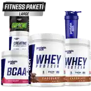 Large Fitness Paketi içeriğinde 2 adet 400g Whey Protein, 280g Supreme Pre Yeşil Elma Aromalı, 300g BCAA+, Aromasız 120g Creatine ve Pocket Shaker bulunmaktadır.
